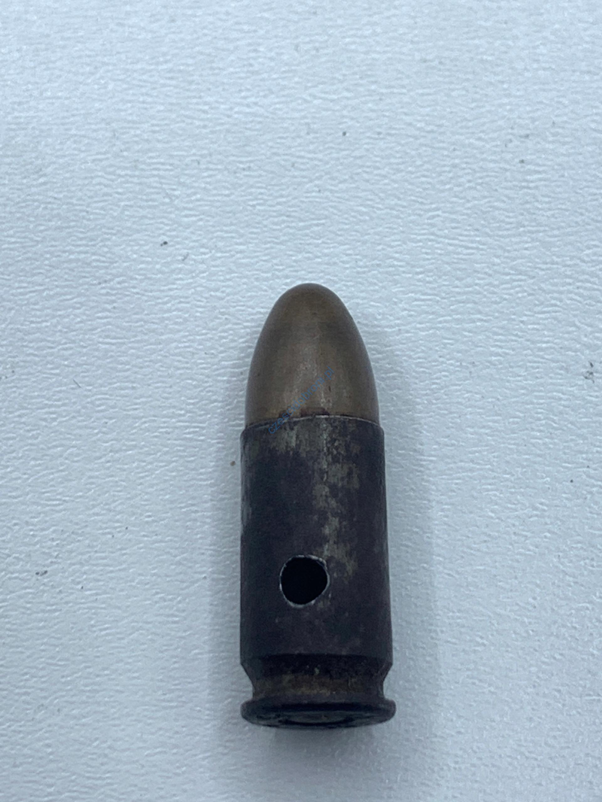 Amunicja pozbawiona istotnych elementów amunicji(pozbawiona ładunku prochowego i spłonka nieaktywna lub zbita).Łuska wiercona.